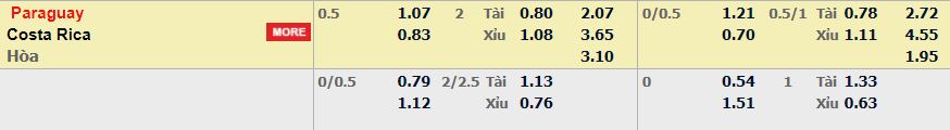 - Mức kèo nhà cái cược chấp trận này: Paraguay chấp 0,5 trái. Paraguay ăn 1,07. Costa Rica ăn 0,83
