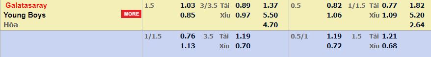 • Mức kèo nhà cái cược chấp trận này: Galatasaray chấp 1,5 Trái. Galatasaray ăn 1,03. Young Boys ăn 0,85