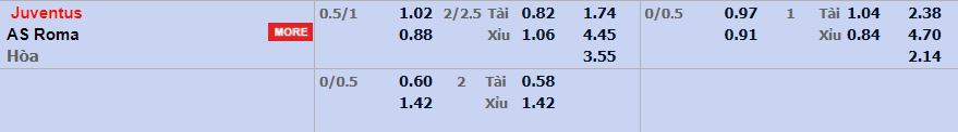 - Mức kèo nhà cái cược chấp trận này: Juventus chấp 0,75 trái. Juventus ăn 1,02. AS Roma ăn 0,88