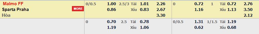 - Mức kèo nhà cái cược chấp trận này: Malmo chấp 0,25 trái. Malmo ăn 1,00. Sparta Praha ăn 0,86