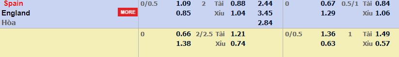 - Mức kèo nhà cái cược chấp trận này: Tây Ban Nha chấp 0,25 Trái. Tây Ban Nha ăn 1,09. Anh ăn 0,85